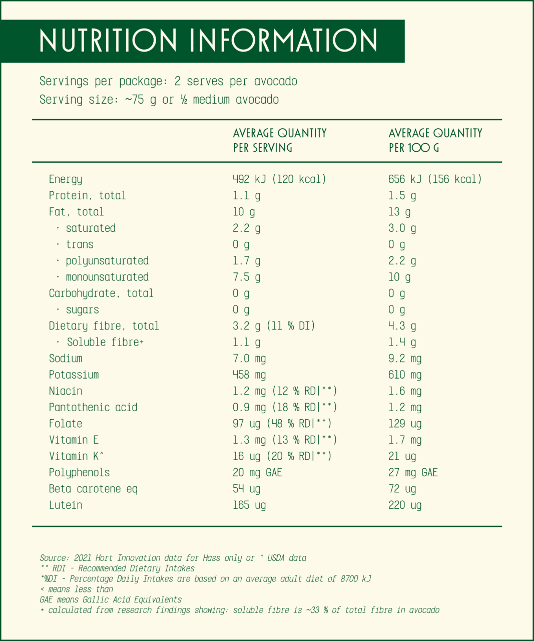 Whether you’re creating a new product line, updating your online menu or finalising nutritional panels for pre-prepared meals, we’ve made it easier than ever to include Australian Avocados with confidence. Our nutritional breakdowns for both Hass and Shepard varieties give you the clear and accurate information you need to meet labelling requirements and keep your dishes deliciously compliant.